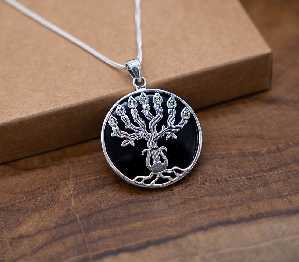 Silver and Onyx Jewish Pendant, Harp and Tree of Life Necklace with Black Onyx